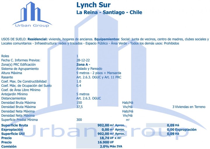 Tterreno para Edificación de Viviendas en La Reina, Santiago, Chile. CERCANO A MALL PLAZA EGAÑA Y ESTACIONES DE METRO Usos del Suelo: VIVIENDA - HOGARES DE ANCIANOS - EQUIPAMIENTO SOCIAL Certificado de Informes Previos DISPONIBLE Superficie: 902 M2 Constructibilidad 1.0 Densidad para 3 Viviendas Altura 9 metros - 2 pisos + Mansarda Precio: 16.900 UF Comisión: 2% + IVA