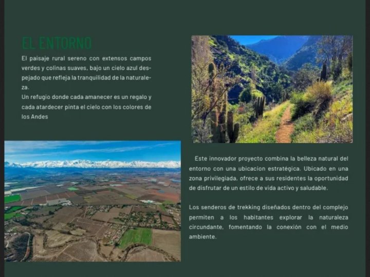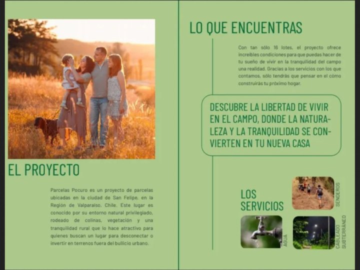 🌿 TERRENO EN PARCELAS RIBERAS DEL POCURO – SAN FELIPE 🌄 Descubre un lugar único donde la tranquilidad del campo y la belleza natural se convierten en parte de tu vida. Parcelas Riberas del Pocuro es un exclusivo loteo de solo 16 parcelas, ubicado en un entorno rural privilegiado de San Felipe, Región de Valparaíso. Rodeado de suaves colinas, vegetación nativa y aire puro, este proyecto te invita a construir tu hogar soñado o invertir en un espacio con gran proyección, lejos del ruido urbano pero a minutos de la ciudad. ✨ Características del proyecto: Superficie desde 5.000 m² Caminos asfaltados 🚗 Acceso controlado con portón automático 🔒 Derechos de agua para regadío 💧 Electricidad soterrada ⚡ Medidor de agua potable 🚰 Senderos y entorno natural 🌳 💰 Precios desde UF 2.150 📍 Vive o invierte en un entorno natural, seguro y con plusvalía asegurada. 🌅 ¡Ven a conocer Riberas del Pocuro y enamórate de su entorno!