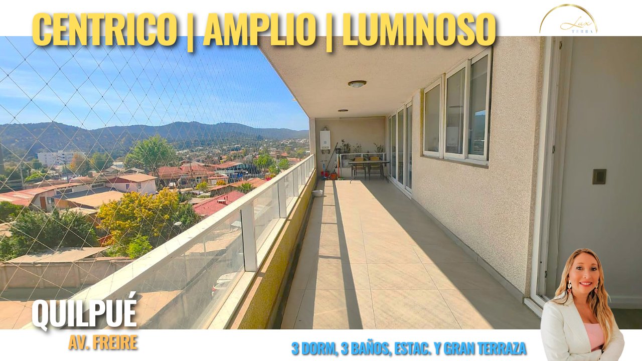 Céntrico | Amplio | Luminoso | Condominio cerrado UBICADO: En exclusiva Av. Principal de Quilpué (Freire) de muchas áreas verdes, a 25 minutos de Viña del mar, a 4 cuadras del METRO Estación El Sol, entre 2 malls, a 2 cuadras del centro de Quilpué. Barrio tranquilo, rodeado de comercio y servicios que tu familia podría necesitar a sólo unos pasos. Movilización 24 horas en la puerta del condominio. EL DEPARTAMENTO: Posee un cómodo hall de acceso, un living comedor iluminado por la gran terraza de 13 metros de largo, una cocina con cubiertas de granito eternas, cocina encimera eléctrica, 2 hornos empotrados, doble lavaplatos, conexión de lavadora y mucho espacio para guardar, junto con una gran logia. Una oficina especial para teletrabajo. Tres modernos baños, tres dormitorios con closets y el principal con walk-in closet y baño en suite. EL EDIFICIO: Moderna arquitectura con diseño que busca la mejor vista y sol. Posee áreas verdes de esparcimiento, piscina de exterior, salón multiuso, gimnasio, lavandería, conserjería con cámaras las 24 hrs y estacionamientos de visita. OTROS: Construido 2015, con 143 m2, de los cuales 32,6m2 son sólo de terraza (13m de largo). $180.000 de gastos comunes. Cuenta con ESTACIONAMIENTO y BODEGA. Contamos con la experiencia y respaldo de Lux Terra Propiedades, con estándares internacionales de calidad, incluyendo acompañamiento bancario, legal, y notarial garantizado, hasta terminar con la llave en su mano. Documentos legales en regla y depto listo para llegar y habitar. Si buscas calidad de vida, todos los servicios, comodidad y seguridad necesarios para poder vivir y disfrutar de una completa tranquilidad , este departamento es perfecto para tu familia, te encantará. No busques más, ¿Qué esperas para conocerlo? Jacqueline Álvarez 988837166