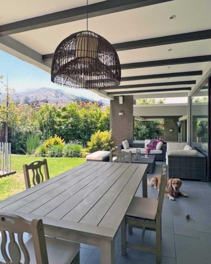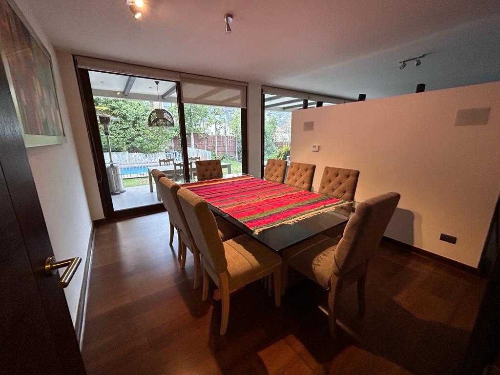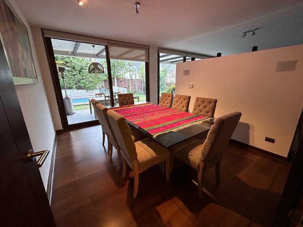 Casa ubicada en sector residencial de Lo Barnechea, con espacios funcionales y buena distribución en dos pisos. La propiedad cuenta con un terreno de 700 m² y aproximadamente 260 m² construidos. Descripción de la Propiedad: 1 primer piso Hall de entrada 1 baño de visita Cocina separa Dormitorio de servicio Amplia logia Amplio comedor con salida a quincho y jardín Living comedor con salida a jardín Jardín con piscina 1 dormitorio en suite con walk in closet y salida a jardín 1 dormitorio chico 2 piso Dormitorio en suite 2 dormitorios 1 baño Sala de estar La propiedad incluye 2 a 3 estacionamientos y una bodega. Ideal para familias que buscan comodidad y buena ubicación.