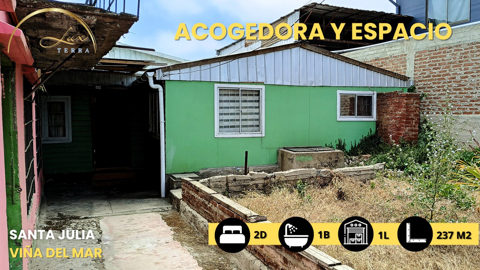 ¡Gran oportunidad en Santa Julia, Viña del Mar! Tu nuevo hogar o inversión ideal te espera. Descubre esta acogedora casa de un piso en sector Santa Julia, uno de los barrios con mejor conectividad y proyección de Viña del Mar. Al ingresar encontrarás un amplio living comedor con excelente iluminación natural que brinda un ambiente cálido y familiar. A un costado destaca su amplia cocina completamente amoblada, con acceso directo al antejardín —perfecta para quienes disfrutan de la comodidad y la funcionalidad en su día a día. La propiedad cuenta con 2 dormitorios de gran tamaño y 1 baño completo, además de un antejardín ideal para reuniones familiares, mascotas o futuras ampliaciones. En el antejardín encontrarás una construcción independiente, ideal para instalar un local comercial o desarrollar una segunda vivienda de 2 pisos. Una excelente alternativa para quienes buscan vivir y emprender en el mismo lugar o generar renta adicional. Ubicación privilegiada: Situada en el corazón de Santa Julia, estarás a pasos de locomoción colectiva, colegios, locales comerciales, centros culturales y complejos deportivos. Además, cuenta con rápido acceso al Camino Internacional, conectando fácilmente con Concón, Quilpué y el resto de Viña del Mar. Perfecta para familias, inversionistas o emprendedores que buscan un espacio con potencial, comodidad y gran ubicación. Contáctanos hoy mismo y agenda tu visita. ¡Esta propiedad tiene todo para convertirse en tu próxima gran inversión en Viña del Mar! En Lux Terra Propiedades, te ofrecemos una experiencia inmobiliaria de alto nivel. Te acompañamos en cada paso, desde la búsqueda hasta la entrega de llaves, con asesoría experta, servicios digitales de vanguardia y respaldo legal y notarial. Seguridad, confianza y excelencia en cada transacción. ¡Hacemos que tu inversión sea fácil y sin preocupaciones!