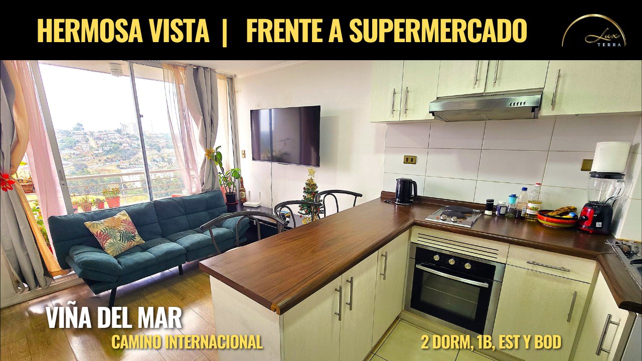 Tranquilidad | Hermosa vista | Frente a Supermercado UBICADO A 13 minutos del centro de Viña del mar, a una cuadra del Camino internacional, Rotonda las Maravillas, Parque acuático, estación de combustible y frente a supermercado, rodeado de colegios, comercio, áreas verdes, etc. Ubicación estratégica que conecta Concón, Viña del mar y Santiago. EL DEPARTAMENTO Encontramos un amplio living-comedor de concepto abierto, que se ilumina por un gran ventanal que conecta con una pequeña terraza adjunta con vista despejada hacia la avenida principal y áreas verdes. Una cocina amoblada con mucho espacio para guardar, con horno, cocina encimera eléctrica y campana. Un pequeño dormitorio con ventana y closet ideal para oficina, pieza de invitados o hijo. Un baño completo de cerámica con tina, lavamanos de granito y gran espejo. Un 2do gran dormitorio, con ventanal y closet dobles, recientemente remodelado en pintura y cubre piso. VARIOS Condominio tranquilo con conserjería 24 horas, recepción, cámaras de seguridad zona de juegos para niños, bicicletero y 2 patios interiores. Departamento construido 2017. 39m2 de departamento, 3m2 de terraza. $45.000 de gastos comunes. Cuenta con BODEGA y ESTACIONAMIENTO privado, Disponibilidad inmediata. Arriendo AÑO CORRIDO renovable. Contactar solo reales interesados, con ingresos iguales o superiores a 3 veces el valor del arriendo y sin problemas en dicom. Se pide 1 mes de garantía, primer mes adelantado y medio mes + iva para gestión inmobiliaria. Contamos con la experiencia y respaldo LUX TERRA, con altos estándares a todos nuestros clientes incluyendo servicios legales y notariales. Si buscas calidad de vida, todos los servicios, la distancia y seguridad necesarios para poder vivir y disfrutar de una completa tranquilidad. Este departamento es perfecto para ti, te encantara. No busques más, ¿Qué esperas para conocerlo? Gabriel Jaramillo 990169369 (Teléfono o whatsapp)