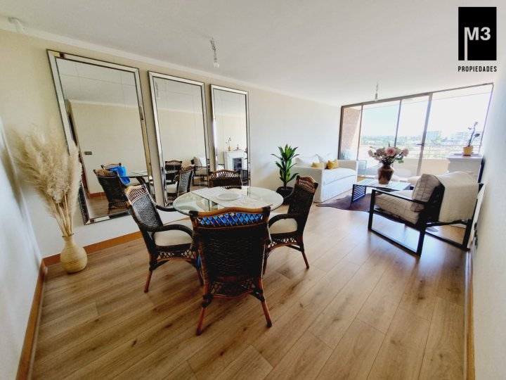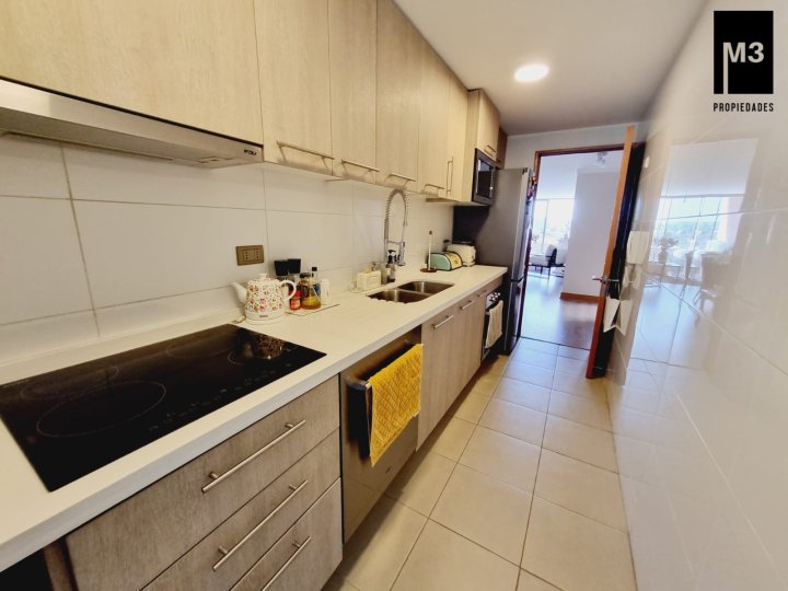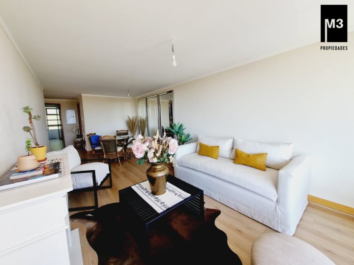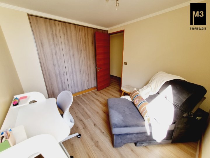 Se vende precioso departamento en condominio Jardines de Raúl Labbé, muy seguro, con agradables áreas verdes, lindas vistas y ambiente muy familiar y tranquilo. - 90 m2 útiles / 100 m2 totales. - Piso flotante en todo el depto. - Calefacción en base a radiadores eléctricos con acumuladores de calor y termostato. - Amplio hall de acceso, con baño de visitas. - Living-comedor con salida a amplia terraza que cruza el departamento. Una vista envidiable a la ciudad y montaña. - Cocina tradicional amoblada y equipada con cubierta de Silestone, encimera vitrocerámica, campana y horno eléctrico.. Logia exterior. - Dormitorio principal con amplios clósets, baño en suite y salida a terraza. - 2 dormitorios de buen tamaño con clóset, baño completo con tina y clóset adicional en pasillo. - 2 estacionamientos independientes más 2 amplias bodegas. - Gastos comunes app. 220,000 EQUIPAMIENTO EDIFICIO: Condominio de 2 torres de 5 pisos cada una, está equipado con salones multiuso, con terrazas exteriores, jardines, juegos infantiles, seguridad 24/7, controlado por cámaras y sistema perimetral microfónico, estacionamientos de visita, generador eléctrico.