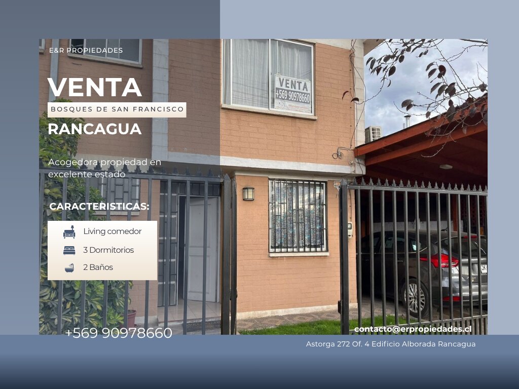 Una casa acogedora, en excelente estado, para vivir cómodamente o como excelente oportunidad de inversión con alto potencial de arriendo rápido. - 3 dormitorios (dos con aire acondicionado) - 2 baños completos - Living comedor - Cocina amoblada, muebles a medida - Terraza y cobertizo - Estacionamiento (o espacio de acceso) Barrio consolidado, zona residencial , tranquilo y con buen acceso a servicios Buena conectividad al centros de Rancagua, supermercados, colegios, servicios. Buena demanda de arriendo: al estar en buen estado y con tres dormitorios, la casa se adapta tanto a familias jóvenes como a profesionales.