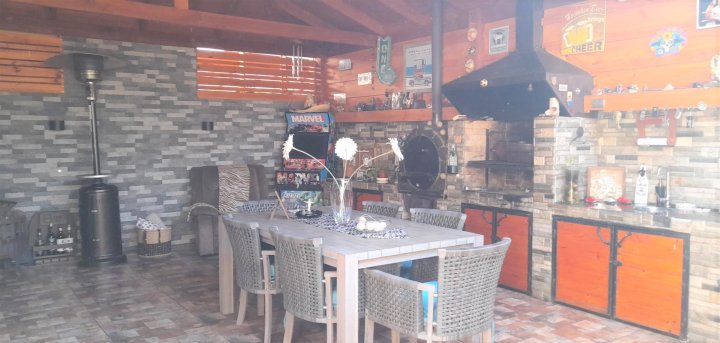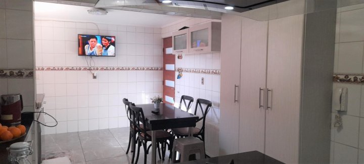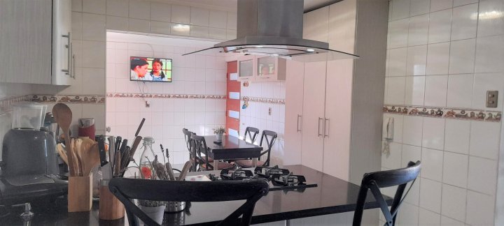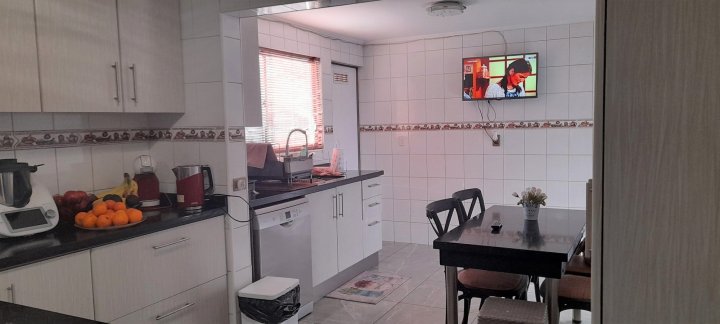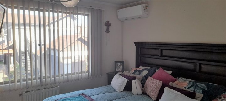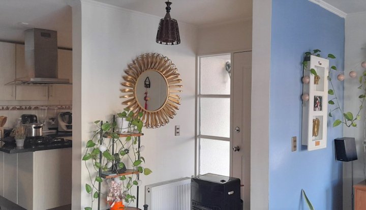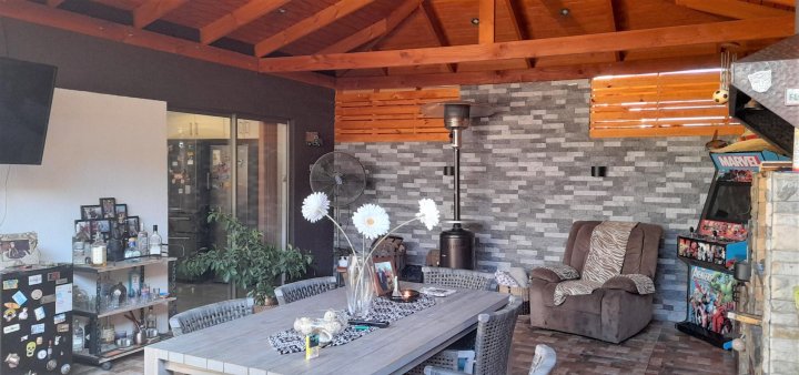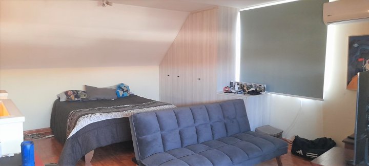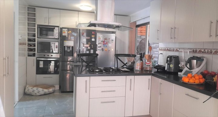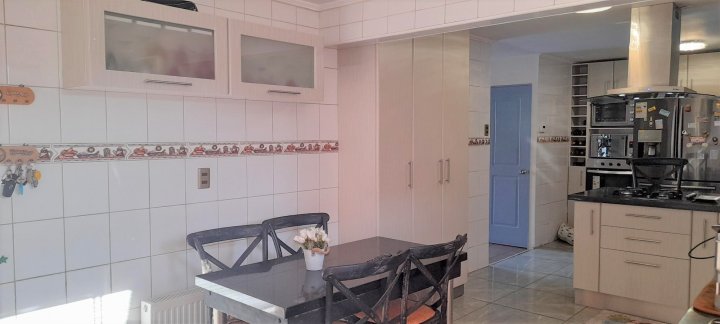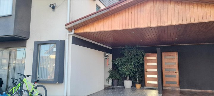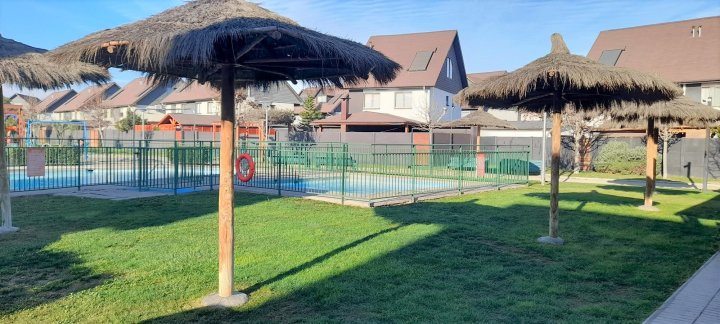 Casa ubicada en condominio residencial en El Rosal, Maipú, con acceso controlado, conserjería y diversas áreas comunes. El entorno cuenta con áreas verdes, juegos infantiles, multicancha, salón de fiestas Club House y piscina, facilitando una vida familiar en un ambiente residencial. La casa se desarrolla en tres pisos. En el primer nivel se encuentra el living y comedor con piso de cerámica y ventanales que permiten la salida a la terraza y antejardín. La cocina es integrada y ampliada, está amoblada, dispone de isla, desayunador y salida directa a terraza con quincho y logia, además de una parrilla y horno integrados en un diseño rústico. El primer piso cuenta también con baño de visitas. La calefacción es central, con sistema de agua caliente a través de calefón y panel solar. El segundo piso posee piso flotante, baño completo amoblado, dormitorio principal en suite con closets grandes, aire acondicionado y baño completo. Hay dos dormitorios adicionales: uno de tamaño amplio y otro de menor tamaño, ambos con closet, piso flotante y el dormitorio medio también cuenta con aire acondicionado. El tercer piso corresponde a una mansarda que puede ser utilizada como dormitorio, escritorio u oficina en casa. Este espacio también dispone de closet grande y aire acondicionado. El condominio ofrece portón automático y estacionamiento para dos vehículos. La propiedad cuenta con terraza, jardín, patio y una bodega. Los gastos comunes son de aproximadamente 90.000 CLP mensuales.