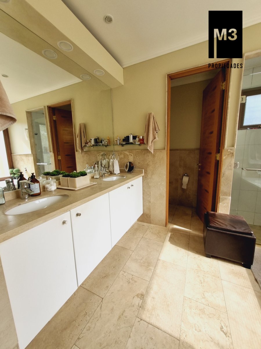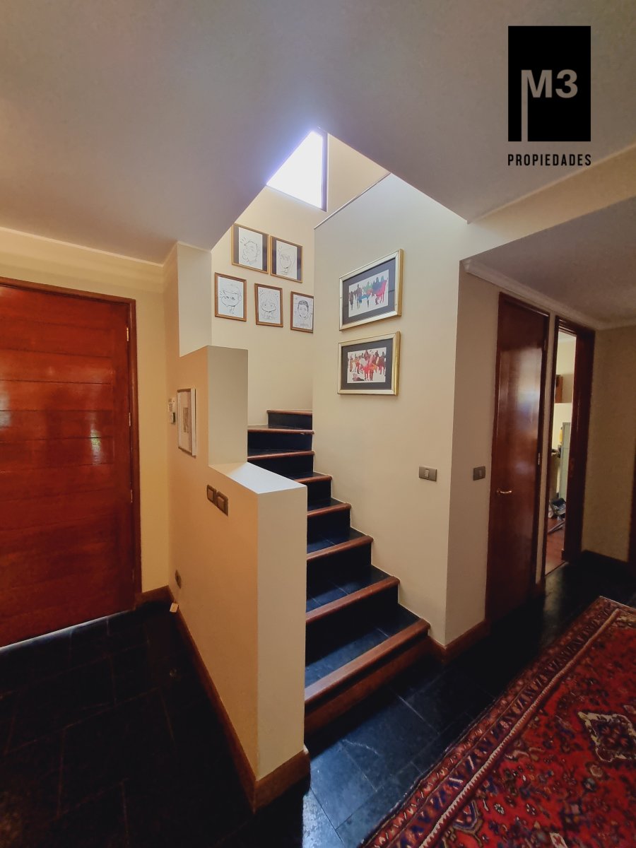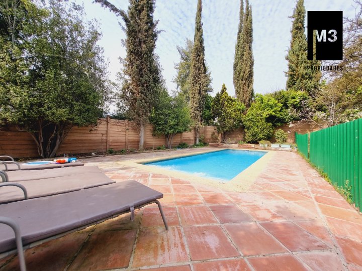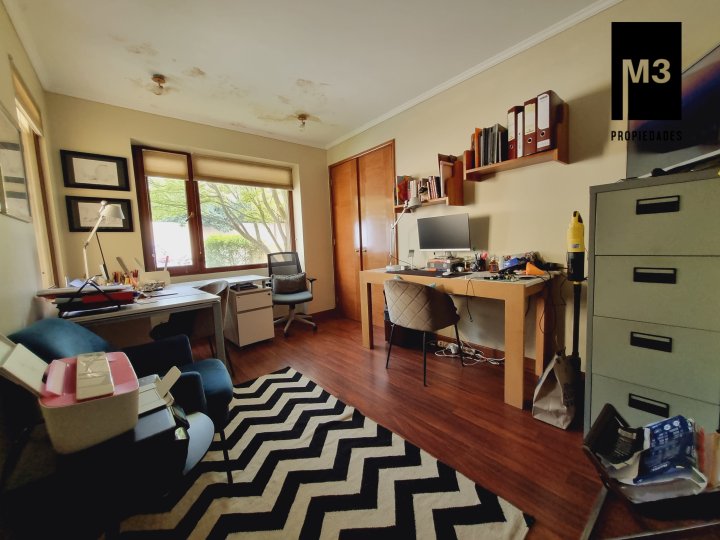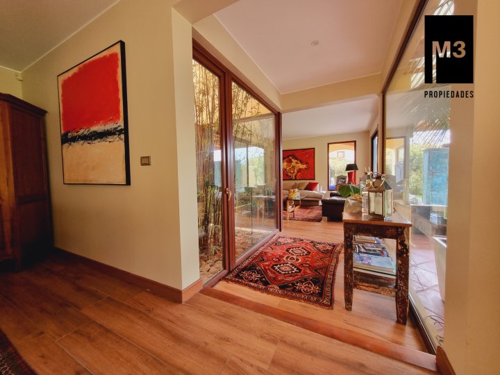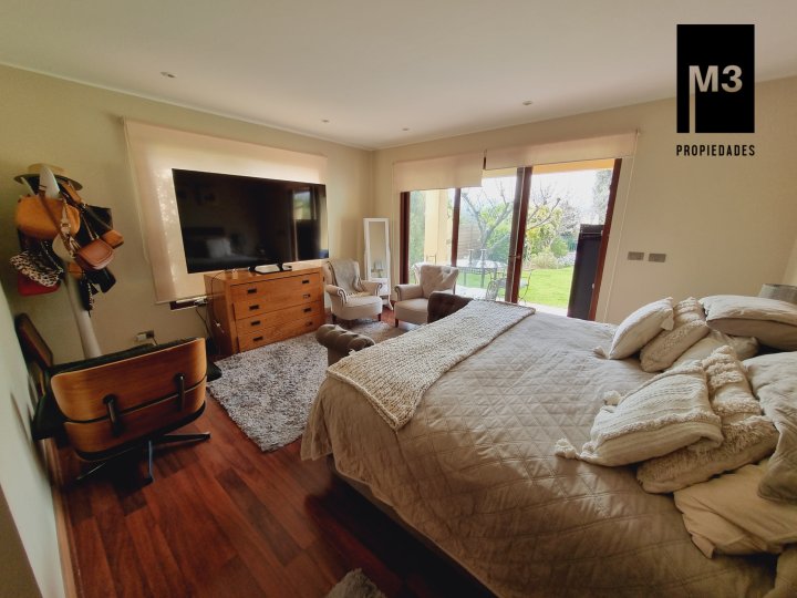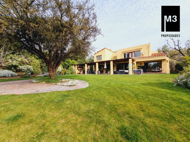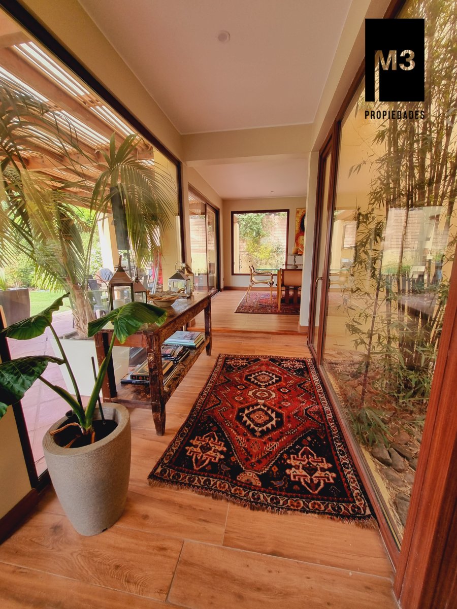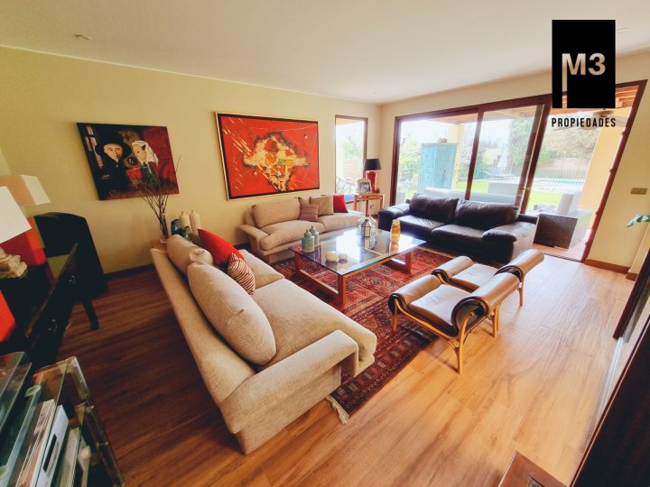 Se vende preciosa casa de 2 pisos en exclusivo sector de Chicureo, en Hacienda de Chicureo con hermosas áreas comunes y una excelente seguridad. Acceso directo a Camino Juan Pablo II, Radial Nororiente. Cercano a comercio, clínicas, servicios y colegios San José, San Anselmo, Verbo Divino, entre otros. GENERAL: - 323 m2 construidos / 1180 m2 terreno. - Calefacción central por losa radiante. - Aspiración central. - Ventanas de PVC folio madera con termopanel. - Dormitorios con píso flotante, - Piscina de 3,5 x 10 mts con reja. - Jardín formado con riego automático. - Estacionamiento para 4 vehículos. 2 de ellos techados. - Año construcción 2007. - Gastos Comunes: $300,000 - Contribuciones: $650,000 PISO 1: - Amplio hall de acceso con vista a patio interior. Piso de piedra pizarra, - Baño de visitas. - Living y comedor independientes con salida a una amplia terraza techada que recorre toda la casa. El piso es porcelanato simil madera. - Cocina amplia, con cubierta de granito, despensa de buen tamaño, comedor de diario, encimera a gas con 6 platillos, horno y campana eléctrica, y en general mucho mobiliario. - Lavadero. - Pieza y baño de servicio de buen tamaño. - Escritorio muy iluminado. - Dormitorio Principal en suite con 2 walking closet. Baño cuenta con ventilación natural, doble vanitorio, jacuzzi, shower door. Cuenta con su propia terraza. PISO 2 - 2 Salas de Estar separadas por la escalera. - 3 dormitorios, uno de los cuales es en suite y los otros 2 comparten un baño completo con ventilación natural. EQUIPAMIENTO: Cancha de golf y club house. Portería y accesos controlados con seguridad las 24 Hrs.