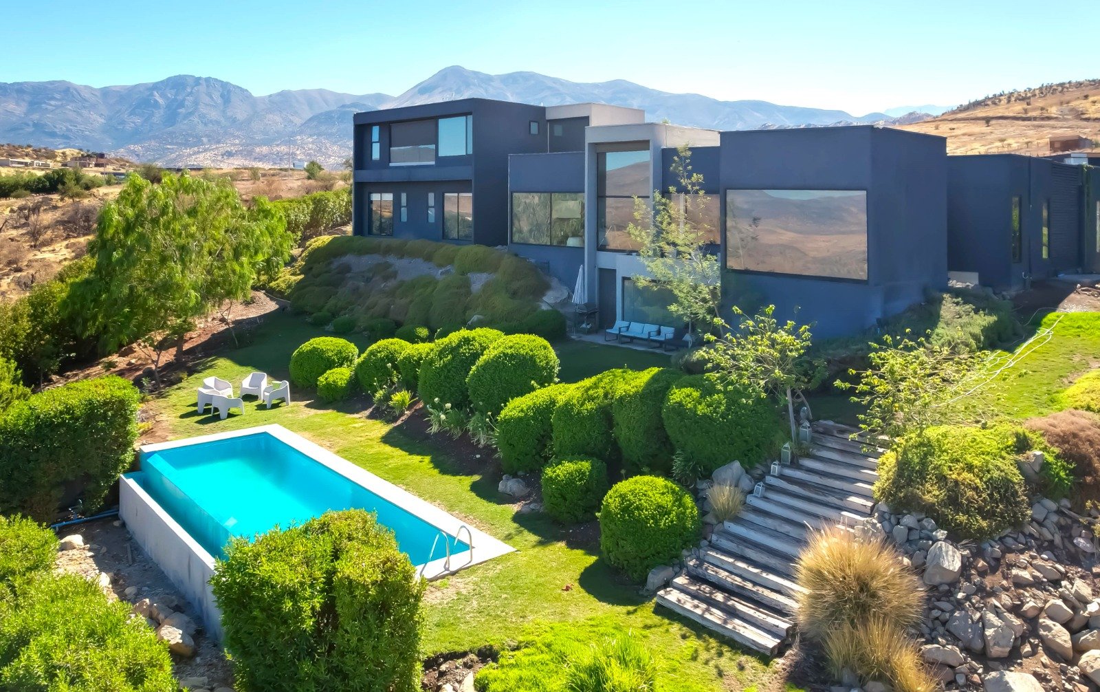 Descubre tu refugio ideal en la prestigiosa Hacienda Chacabuco, ubicada en la comuna de Colina, Región Metropolitana de Chile. Esta propiedad excepcional, que ofrece el equilibrio perfecto entre lujo y tranquilidad, te invita a experimentar un estilo de vida inigualable. Moderna, luminosa e impecable casa en VENTA , estilo mediterránea con espectacular vista hacia La Cordillera de la Costa, ubicada en condominio cerrado. Seguridad 24/7. Sistema safecard de entrada. 3 Dormitorios en Suite + 5 Baños + Servicios + Sala de Estar + 2 Oficinas o cuarto y quinto dormitorios + Piscina + Terraza Techada + Jardín + 2 Bodegas + 3 Estacionamientos. Distribución: -Primer Nivel: Hall de acceso de doble altura con hall de distribución. Baño de visita con luz natural. Living y comedor independientes con vista despejada y asegurada hacia La Cordillera y El Valle. Cocina semi integrada completamente equipada con isla central y comedor de diario para 4 personas. También cuenta con vista despejada y asegurada. Pieza y baño de servicio. Logia independiente. Sala de estar lateral. 2 Oficinas independientes. 2 Dormitorios en suite con clóset de muro y vista despejada. -Segundo Nivel: Dormitorio principal en suite con walk-in clóset con lucarna, espectacular baño con shower door, tina, vanitorio doble y zona de WC independiente. Con salida a terraza. -Nivel -1: Terraza cerrada con ventanas de cristal plegables y salida al jardín. Jardín formado con riego automático. Espectacular piscina de borde infinito. -Equipamiento: Sistema de vigilancia por cámaras. Calefacción por losa radiante. Paneles solares. Aire acondicionado. Ventanas de termopanel. Portón eléctrico. Cortinas roller y cortinas roller eléctricas. 2 Bodegas. 3 Estacionamientos techados. 350 m2 útiles. 22.314 m2 de terreno. -Condominio: - Vigilancia y control de acceso. - Laguna y caballerizas. - cerros y lugares bellisimos para trekking, caminatas, pic nic.