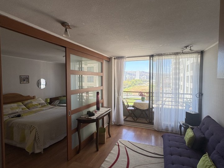 Vicenza Agente Inmobiliario arrienda cómodo y luminoso departamento ideal para estudiantes, ubicado en el centro de Viña del Mar, calle Traslaviña, Edificio Blue. Excelente ubicación a pasos de universidades, playa, bancos, centros comerciales y con locomoción a la puerta hacia Viña del Mar y Valparaíso. El departamento cuenta con un dormitorio amplio equipado con cama de dos plazas y escritorio, baño espacioso, living con futón, cocina completamente equipada con encimera a gas y horno eléctrico empotrado, además de una terraza con mesa para disfrutar la vista. Es un espacio soleado, funcional y listo para habitar. Arriendo disponible desde marzo a diciembre, pensado especialmente para el periodo académico. Valor mensual de 600.000 pesos con gastos comunes incluidos