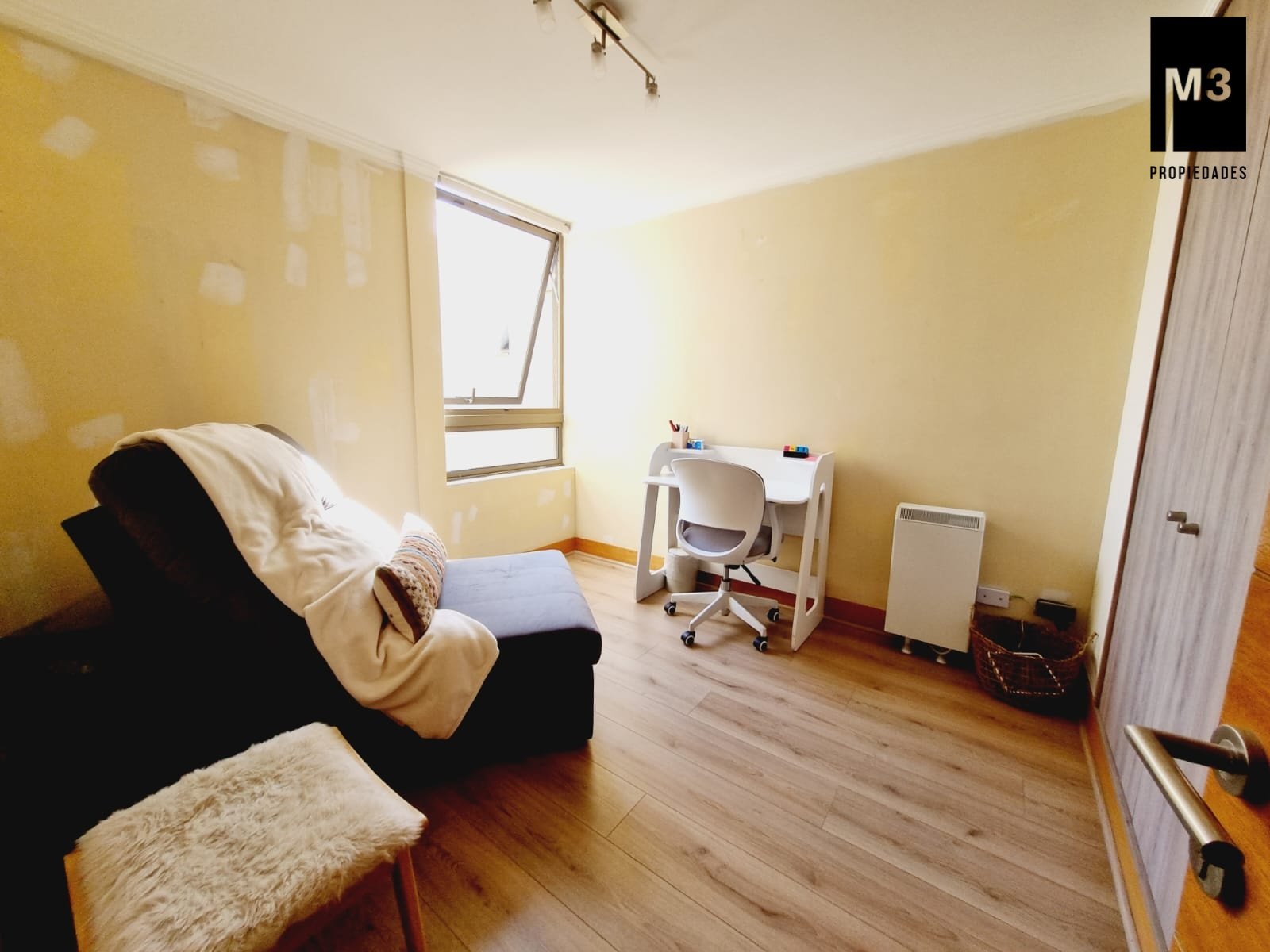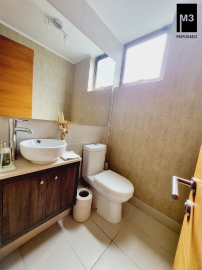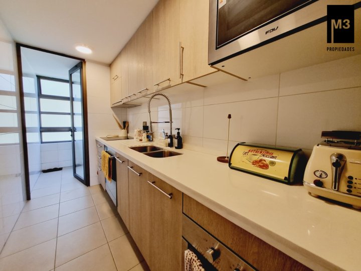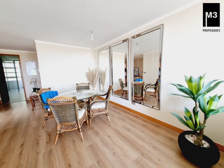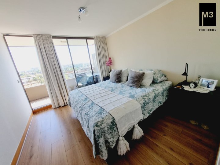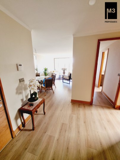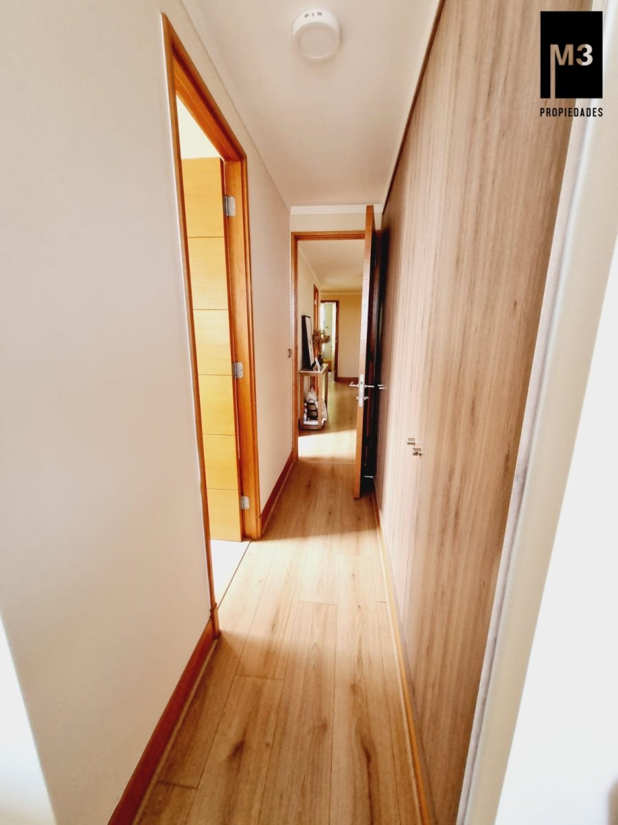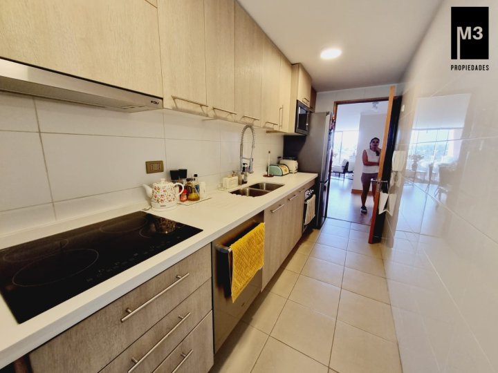 Se vende precioso departamento en condominio Jardines de Raúl Labbé, muy seguro, con agradables áreas verdes, lindas vistas y ambiente muy familiar y tranquilo. - 90 m2 útiles / 100 m2 totales. - Piso flotante en todo el depto. - Calefacción en base a radiadores eléctricos con acumuladores de calor y termostato. - Amplio hall de acceso, con baño de visitas. - Living-comedor con salida a amplia terraza que cruza el departamento. Una vista envidiable a la ciudad y montaña. - Cocina tradicional amoblada y equipada con cubierta de Silestone, encimera vitrocerámica, campana y horno eléctrico.. Logia exterior. - Dormitorio principal con amplios clósets, baño en suite y salida a terraza. - 2 dormitorios de buen tamaño con clóset, baño completo con tina y clóset adicional en pasillo. - 2 estacionamientos independientes más 2 amplias bodegas. - Gastos comunes app. 220,000 EQUIPAMIENTO EDIFICIO: Condominio de 2 torres de 5 pisos cada una, está equipado con salones multiuso, con terrazas exteriores, jardines, juegos infantiles, seguridad 24/7, controlado por cámaras y sistema perimetral microfónico, estacionamientos de visita, generador eléctrico.