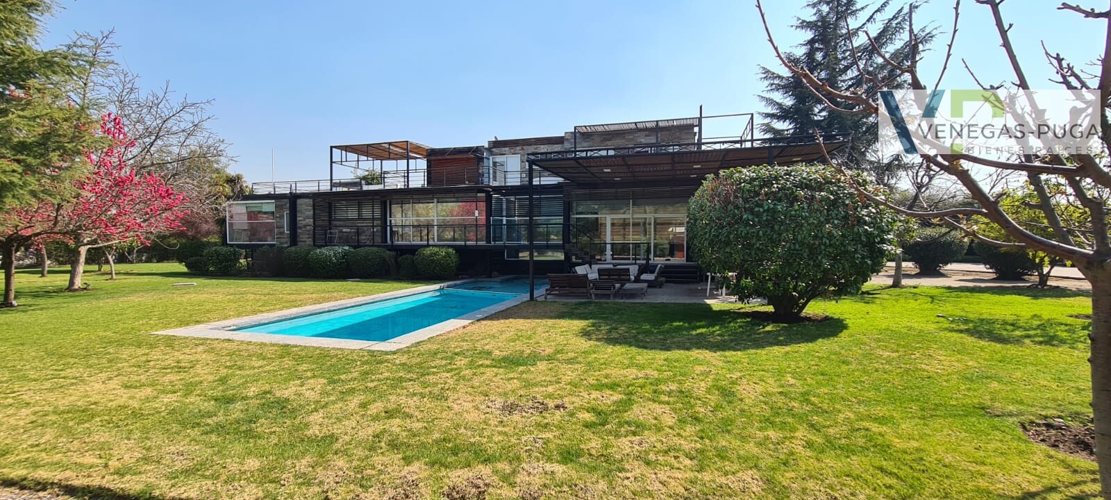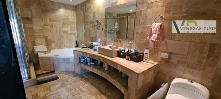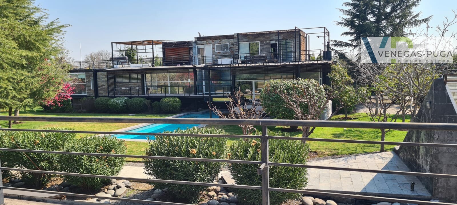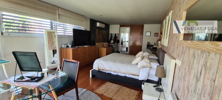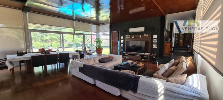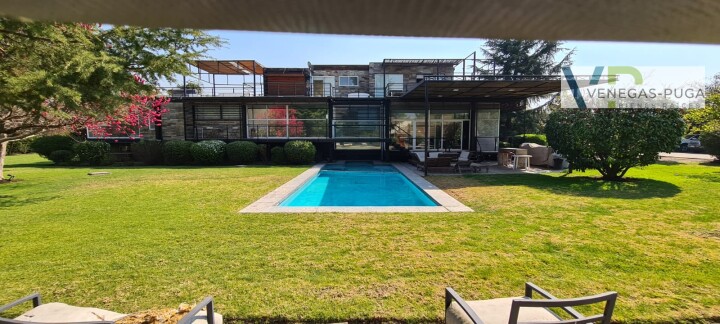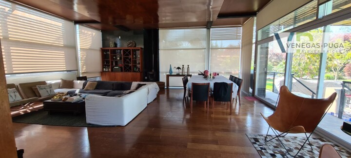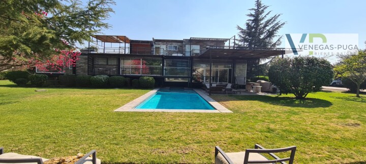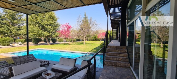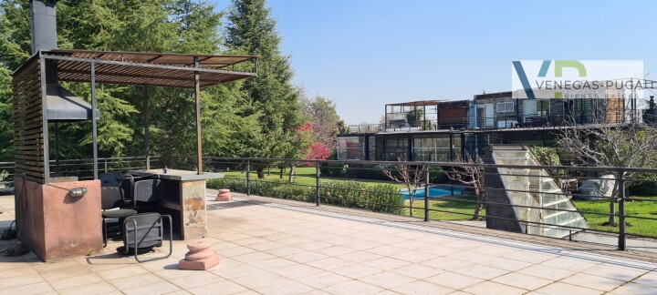 Vive en unos de los mejores y exclusivos condominios de Chicureo, seguridad las 24 hrs. del día, cerca de colegios, excelente conectividad. Las mejores canchas de golf. Casa de estilo moderno, excelente ubicación cerca del club de golf !!! Primer piso: Hall de distribución, baño visita, living y comedor juntos, cocina amoblada, sala de estar o estudio con escalera caracol que conecta al segundo piso. Dormitorio principal en suite, walking closet, amplio dormitorio segundario. Segundo piso: En este piso se encuentra un dormitorio muy amplio (originalmente eran dos dormitorios) baño. Y una gran terraza que rodea toda la casa. Subterráneo: Se encuentra la lavandería, dormitorio de servicio y una sala que podría usarse como gimnasio u otro dormitorio. Quincho: Este recinto independiente a la casa se encuentra una construcción de tres niveles, se accede nivel de suelo y va descendiendo los niveles. En el cual se encuentra una gran sala de juegos con un bar y sala de estar, área de dormitorio con un baño completo. tiene alrededor de 100 m2. En la azotea tiene la parrilla con campaña y muele en obra. Jardín: Precioso jardín formado por macizos arbustivos, arboles frutales, área de huerta, piscina temperada. Otros: • Área para gimnasio, amplia bodega. • Estacionamientos. • Calefacción por radiadores • Ventanales termopanel • Pisos piedra pizarra y flotante.