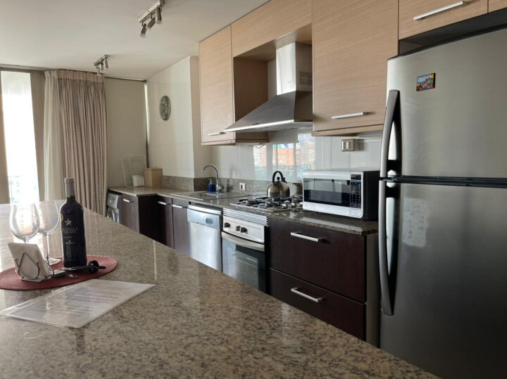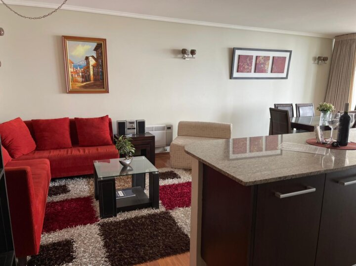 Departamento con excelente ubicación en Nueva Libertad, a pasos de los mall Marina Arauco y Espacio Urbano, parque Las Salinas, Av. San Martín, supermercados, restaurantes, servicios, centros deportivos y de salud. Muy buena conectividad por avenidas principales hacia el norte, sur y el interior de la región. El departamento está amoblado y cuenta con 2 amplios dormitorios y 2 baños, principal en suite y con walking closet. Living comedor amoblado con cocina integrada amoblada con cubiertas de granito y amplia isla, equipada con refrigerador, encimera a gas, horno eléctrico, microondas y campana. Instalación para lavadora. Amplia terraza con vista que recorre todo el departamento. Incluye un estacionamiento. El edificio cuenta con dos piscinas (interior temperada y exterior), gimnasio, sauna, lavandería, estacionamientos de visita. Seguridad y accesos controlados 24/7